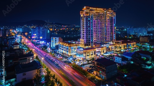 © Ahmad, Obraz premium Illuminated city skyline at night with vibrant lights on a modern building.