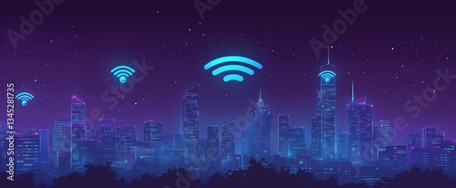 Fototapeta premium Illuminated city skyline displaying wireless internet signal symbols in the...