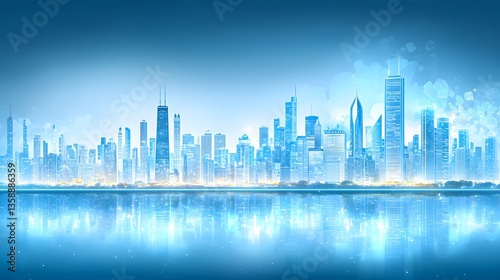 © wiwat apisithpinyo, Fototapeta premium Illuminated City Skyline Reflected in Water with Modern Skyscrapers Against a Blue Night Sky