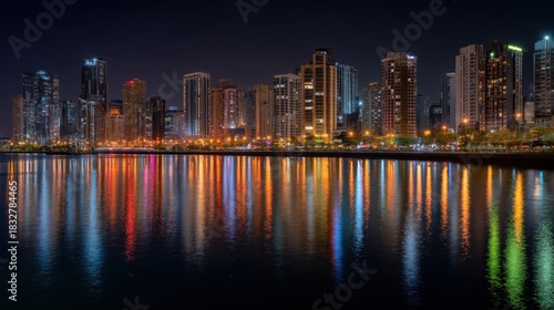 Naklejka premium Illuminated city skyline with colorful light reflection on water at night....