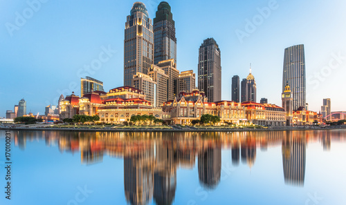 © kalafoto, Naklejka premium illuminated city waterfront downtown skyline with Haihe river,Tianjin,China.