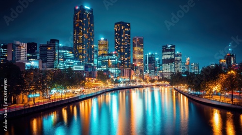 © TopMedia, Fototapeta premium Illuminated Cityscape at Night with Glowing Reflections