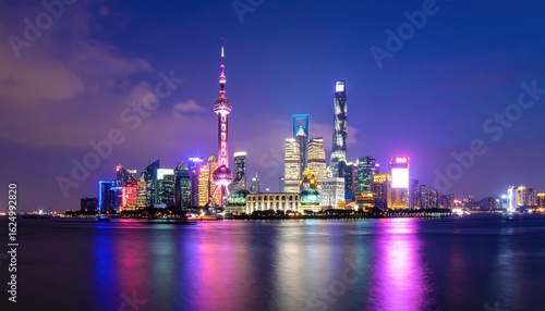 © Agung, Obraz premium Illuminated cityscape at twilight reflecting on water