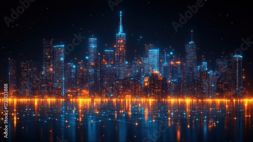 Obraz premium Illuminated cityscape reflecting on water at night with glowing lights