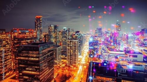 Obraz premium Illuminated Cityscape With Network Connections At Night, Digital...