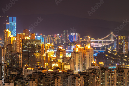 © zhouyilu, Obraz premium Illuminated Cityscape with Skyscrapers and Bridges at Night