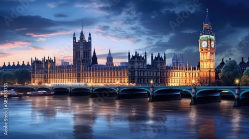 Obraz premium Illuminated Clock Tower in Cityscape with Reflection on River