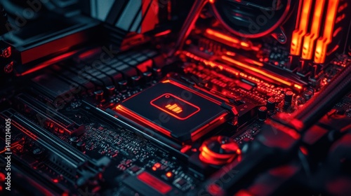 Fototapeta premium Illuminated computer component with a red glow within a dark system