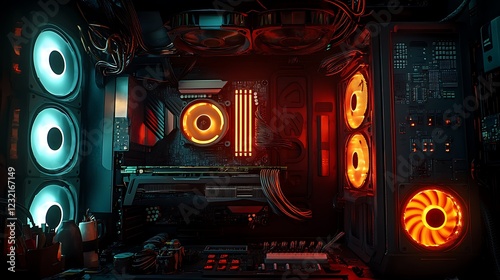 Obraz premium Illuminated Computer Interior Showing Components and Cooling Fans