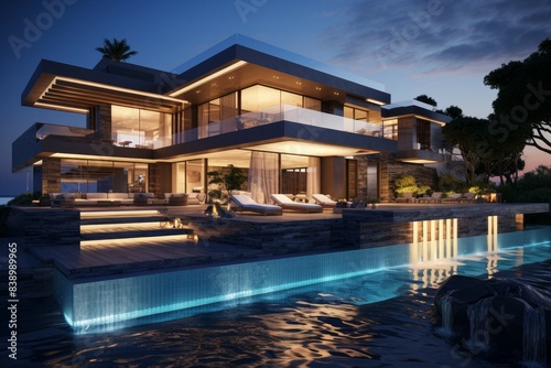 Obraz premium Illuminated contemporary home with pool at dusk, showcasing sophisticated...
