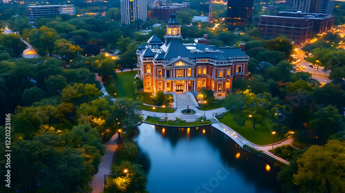 Obraz premium Illuminated courthouse, city park twilight, aerial view, urban landscape,...