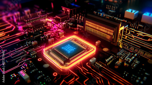 © Maulid, Obraz premium Illuminated CPU on Motherboard, Technology Background, High-Tech Computing, for Tech Articles.