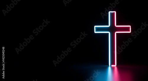 © Image, Fototapeta premium Illuminated Cross against Dark Backdrop with Cyan and Magenta Glow, a Symbol of Faith