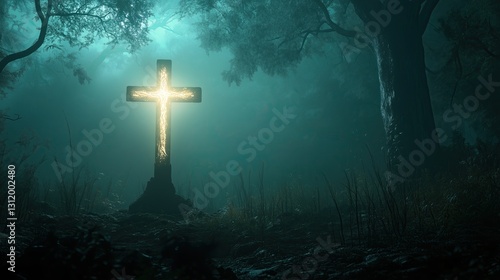 © จิรายุทธ แถบเงิน, Naklejka premium Illuminated cross in a serene forest setting.