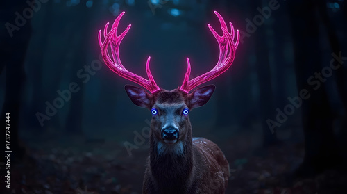 © Juan, Fototapeta premium Illuminated Deer in Enchanted Forest: A majestic deer with radiant, neon antlers and glowing eyes stands amidst the mystical darkness of an enchanting forest, bathed in an ethereal glow.