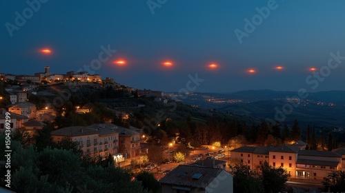 © kun, Fototapeta premium Illuminated discs above a hillside town at dusk.