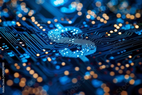 © AlirezA, Fototapeta premium Illuminated dollar symbol on circuitry background representing modern finance and technology in a digital age