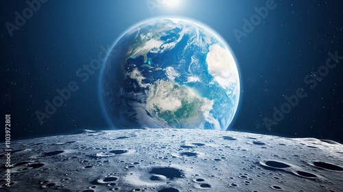Obraz premium Illuminated earth globe view from moon image. Lunar surface with craters against planet in dark space photography scene wallpaper. Solar system exploration concept photorealistic photo
