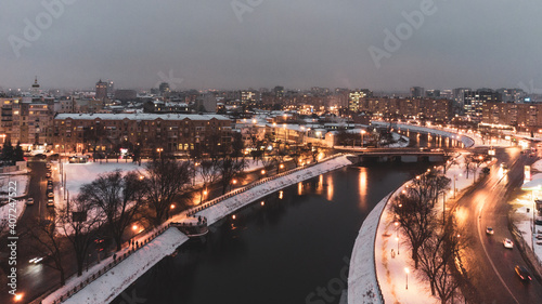 © Kathrine Andi, Fototapeta premium Illuminated evening riverbank with lights reflection in dark water near Skver Strilka in Kharkiv city center. Winter aerial colorful color graded photo