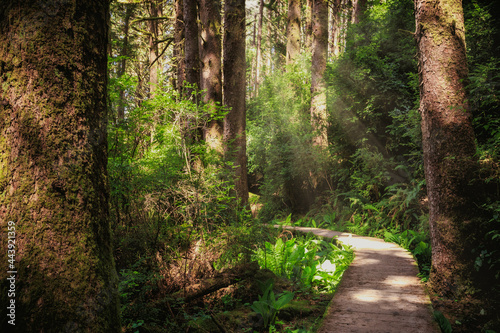 © Stephen, Fototapeta premium Illuminated Forest Path at Fern Canyon, Prairie Creek Redwoods State Park in Humboldt County, California