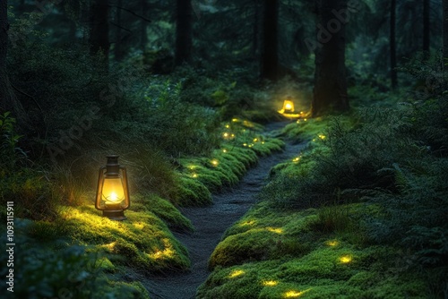 © Prism Trail, Obraz premium Illuminated Forest Path With Lanterns And Moss
