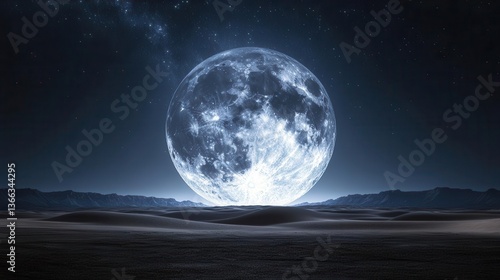 © Madhan, Fototapeta premium Illuminated Full Moon Rising Over Calm Ocean with Starry Night Sky and Expansive Horizon