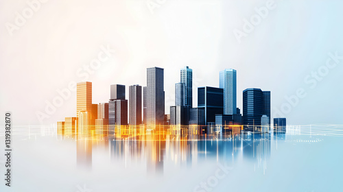 Obraz premium Illuminated Futuristic Cityscape With Modern Architecture and Digital Network Connections Reflected on Surface at Twilight