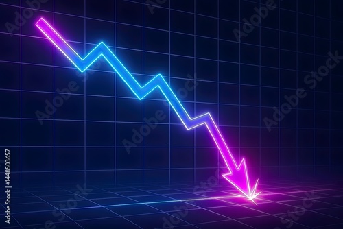 Naklejka premium Illuminated futuristic financial graph descending sharply, crashing into digital floor, symbolic illustration of severe market decline, investment crisis, and economic instability.