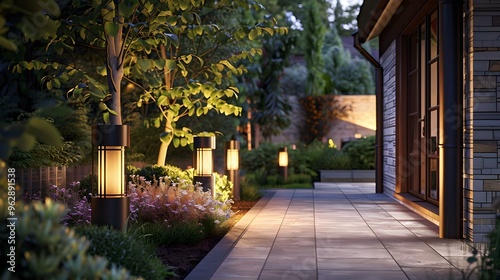 © Yelena, Fototapeta premium Illuminated Garden Path Backyard Design with Stone Pathway and Lush Greenery