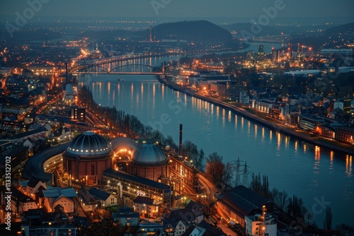 © Vadim, Fototapeta premium Illuminated Gasometers and Cityscape at Night with River, Citylights, Reflections on Water