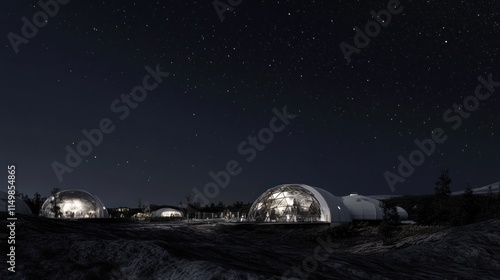 Naklejka premium Illuminated geodesic domes under a starry night sky, nestled in a rocky...