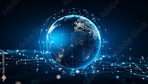 Fototapeta premium Illuminated globe encased in a network of glowing lines against a dark backdrop