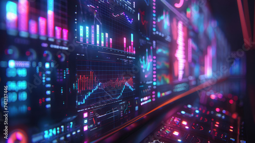 Fototapeta premium Illuminated graphs and data on multiple computer monitors showcasing financial market analysis or trading dashboard. A modern, high-tech feel conveyed through vibrant colors and digital displays.