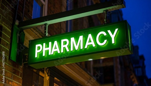 © Bayu, Obraz premium Illuminated green pharmacy sign at night