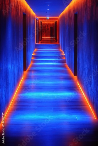 © Grapy Media, Fototapeta premium Illuminated Hallway with Vibrant Blue and Orange Glow Architectural Interior Design