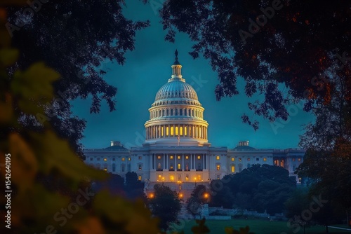 © oio, Fototapeta premium Illuminated historical government building dome at dusk framed by dark tree branches and foliage