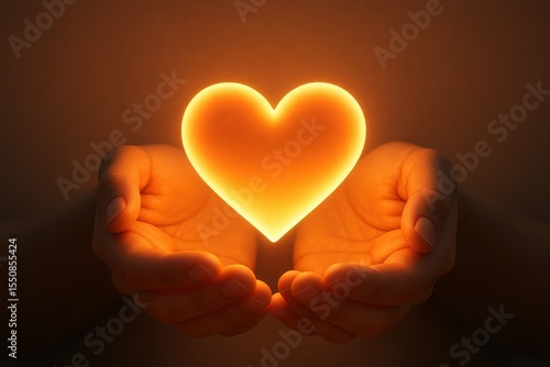 Fototapeta premium Illuminated Human Heart Symbol Representing Love and Care in Protective Hands with Warm Golden Light