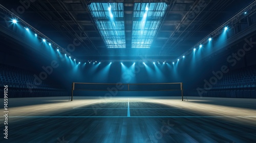 Fototapeta premium Illuminated indoor badminton court with dramatic lighting and empty seating