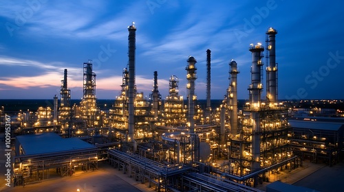 © Pumapala, Fototapeta premium Illuminated Industrial Complex at Dusk