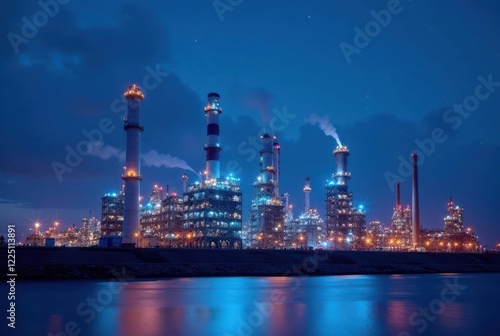 © Angel Pic, Naklejka premium Illuminated Industrial Complex at Night Reflecting on Calm Waters