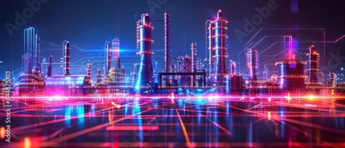 © TeteraX, Obraz premium Illuminated Industrial Complex at Night With Digital Network
