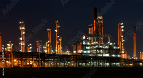 © FYN ART, Fototapeta premium Illuminated industrial complex at night with multiple towers and pipelines under a dark blue sky, creating a stark contrast between the bright facility and the surrounding darkness.