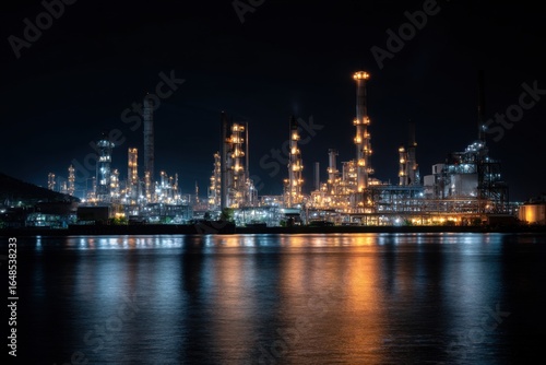 © munirahsamsudin, Fototapeta premium Illuminated Industrial Complex at Night with Reflection on Water