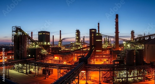 Naklejka premium Illuminated Industrial Complex at Twilight Revealing the Heart of Manufacturing Activity