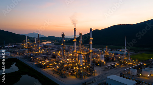 © A2Z AI , Obraz premium Illuminated industrial complex set against a dawn sky and mountainous backdrop, showcasing manufacturing and energy infrastructure.