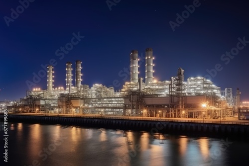 © evening_tao, Naklejka premium Illuminated Industrial Plant at Night