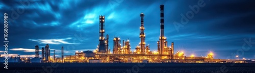 Naklejka premium Illuminated Industrial Refinery at Dusk with Dramatic Sky and Bright Lights...