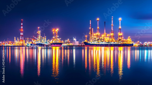 © Hestutiningsih, Naklejka premium Illuminated Industrial Refinery at Night with Lights Reflecting on Calm Water Under Blue Sky