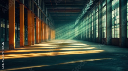 Fototapeta premium Illuminated industrial space with sunlight rays abandoned factory interior...