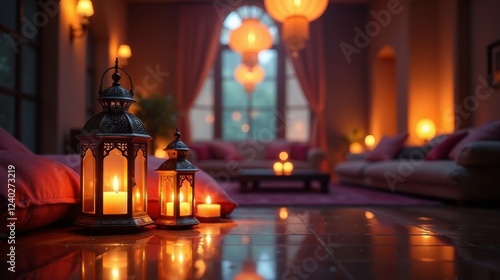 © DeeDay, Fototapeta premium Illuminated Interior Ornate Lanterns Cast a Warm Glow on Polished Floor in a Cozy Living Room Setting